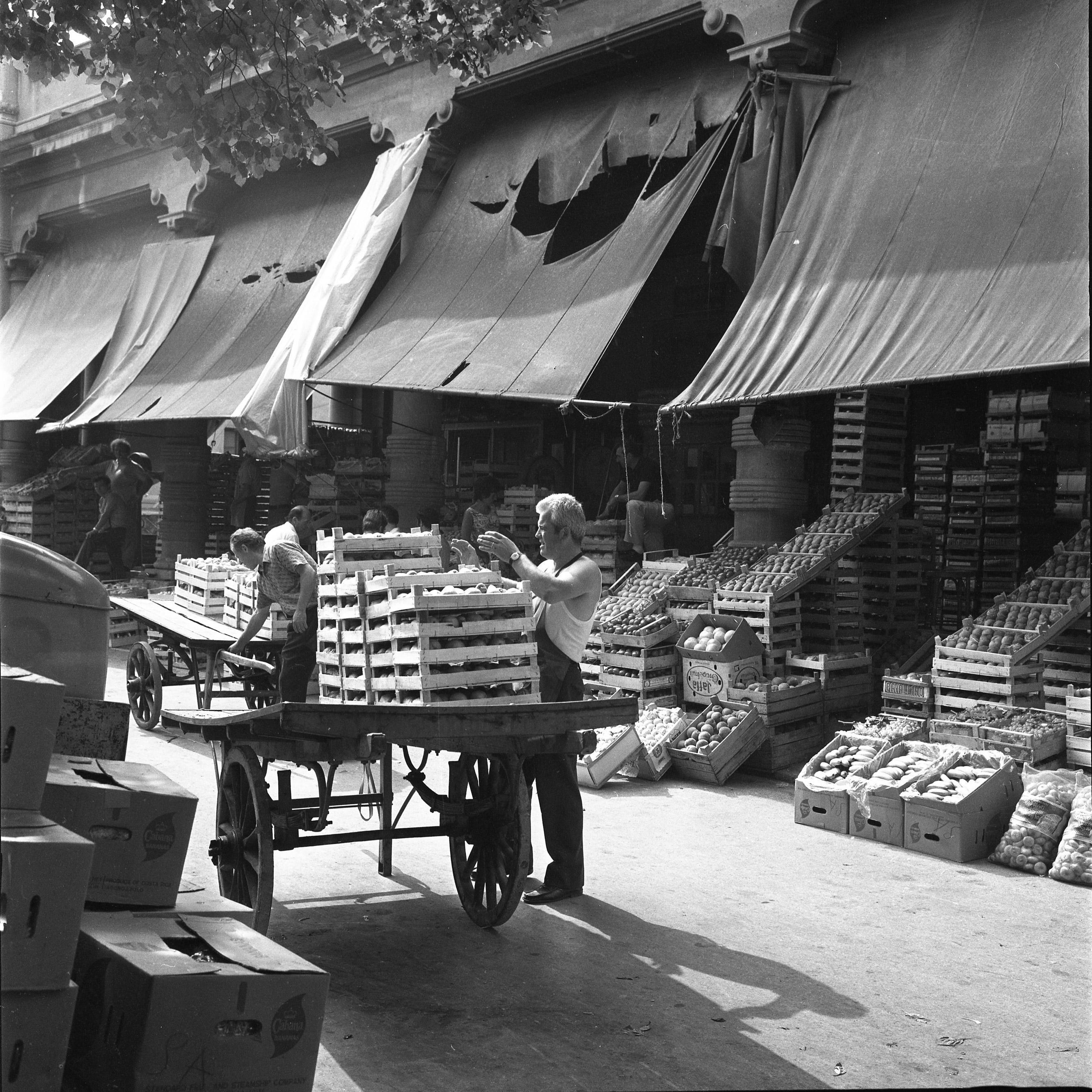 Commercianti con cassette di frutta e verdura all’interno del Mercato ortofrutticolo, anni ’70 (©Fausto Asperti/ Foto Express - Museo delle storie di Bergamo, Archivio fotografico Sestini) - Merchants with crates of fruit and vegetables in the farmer’s market, 1970s (Fausto Asperti/ Foto Express - Museo delle storie di Bergamo, Archivio fotografico Sestini)